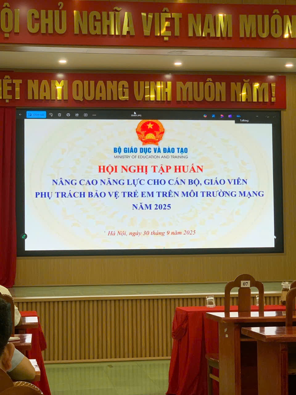 Sáng ngày 30/9/2025, thầy Lê Xuân Duyến – Tổng phụ trách Đội trường THCS Nguyễn Khuyến đã tham dự trực tuyến “Hội nghị tập huấn nâng cao năng lực cho cán bộ, giáo viên phụ trách bảo vệ trẻ em trên môi trường mạng” do Bộ Giáo dục và Đào tạo tổ chức tại Hà Nội.