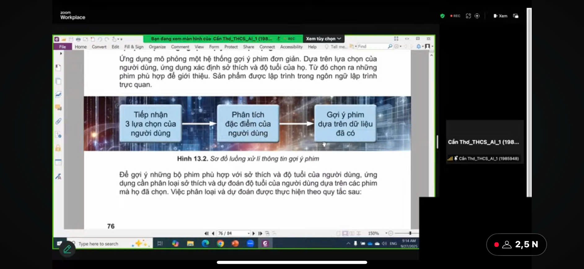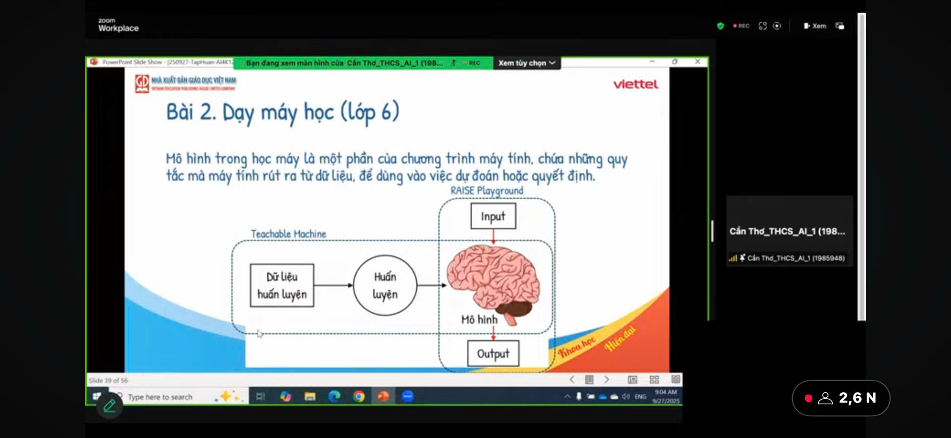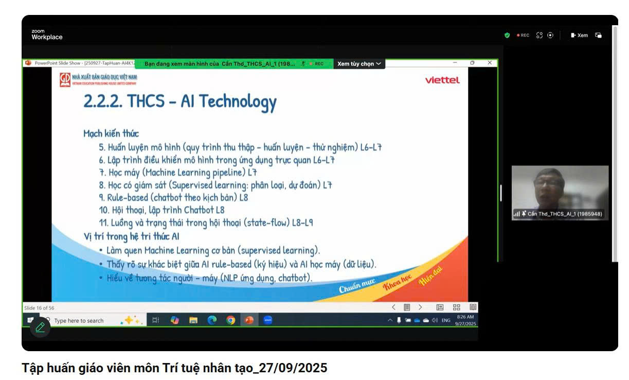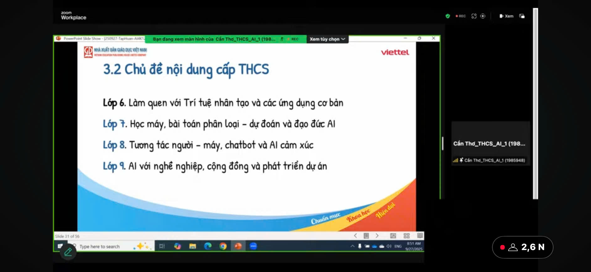 Thực hiện theo công văn số 1574/NXBGDVN ngày 22/9/2025 của Nhà xuất bản Giáo dục Việt Nam về việc giới thiệu, tập huấn sử dụng bộ tài liệu Trí tuệ nhân tạo từ lớp 1 đến lớp 12, ngày 27/9/2025, cán bộ quản lý và giáo viên trường THCS Nguyễn Khuyến đã tham gia buổi tập huấn trực tuyến do Nhà xuất bản Giáo dục Việt Nam phối hợp cùng Tập đoàn Công nghiệp – Viễn thông Quân đội (Viettel) tổ chức.